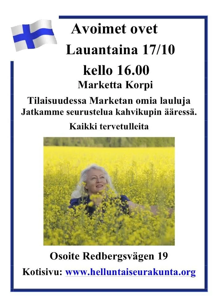 La 17/10 klo 16.00 - Avoimet ovet Marketta Korpi lauantai 17. lokakuuta 2020 16.00 18.00 Google-kalenteri ICS